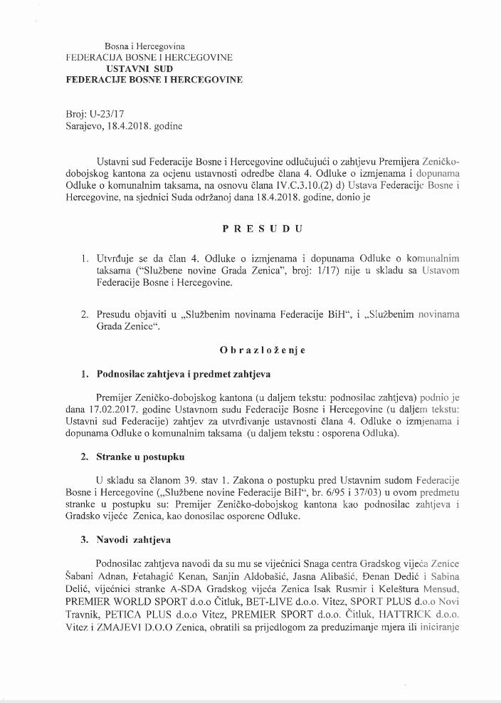 Više od 100 presuda Ustavnog suda FBiH i kantonalnih sudova u korist priređivača igara na sreću – Nakon Bugojna, Hadžića, Ilidže, Breze, Kaknja, Posušja.., popis gradova/općina koje su prekršile Ustav FBiH prilikom donošenja odluka o komunalnim taksama dodatno je proširen. Naime, presudama U-35/16, U-16/17 te U-5/17 od 18.04.2018. godine, objavljenim u Službenim novinama FBiH 20.07.2018. godine, Ustavni sud FBiH je presudio da odluke o komunalnim taksama u Gornjem Vakufu-Uskoplju, Donjem Vakufu i Visokom nisu u skladu s Ustavom FBiH, dok je Kantonalni sud u Bihaću presudom broj 01 0 U 011805 16 U od 19.07.2018. presudio da je neustavna Odluka o komunalnim taksama u Velikoj Kladuši.