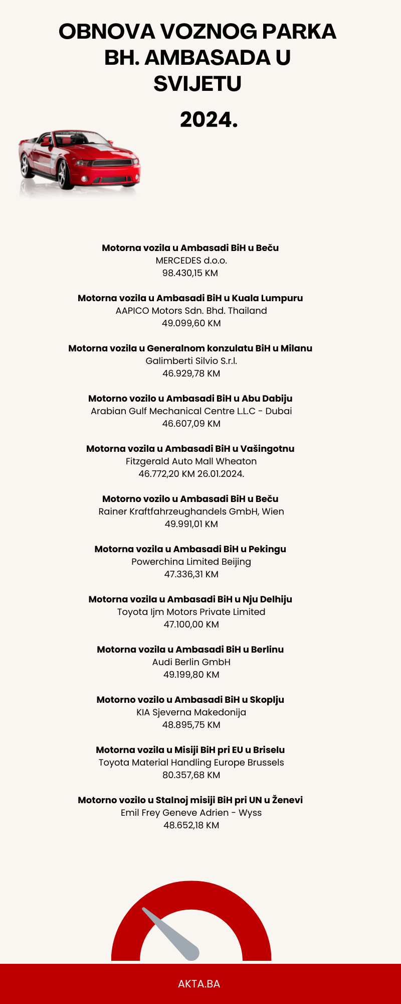 Shodno objavljenim godišnjim dodjelama i dosadašnjoj nabavci motornih vozila za bh. ambasade, pitali smo Ministarstvo vanjskih poslova Bosne i Hercegovine koliki je broj službenih specijalizovanih vozila za potrebe DKP BiH prema Pravilniku o uslovima nabavke i načinu korištenja službenih specijalizivanih vozila. Također, zanimalo nas je koliki je trenutni broj kojim raspolažu diplomatsko-konzularna predstavništva BiH i koje klase. Ipak, ni nakon 10 dana čekanja i nekoliko urgencija nismo dobili odgovor. Ukoliko ga dobijemo, naknadno ćemo ga objaviti.