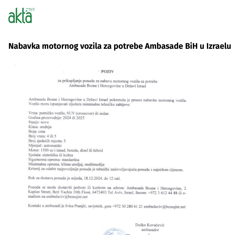 Na osnovu poziva objavljenom u decembru, ambasador Duško Kovačević traži novo putničko vozilo SUV (crossover) ili sedan, koje je proizvedeno 2024. ili 2025. godine.