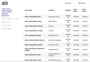 Prema do sada objavljenim godišnjim obavještenjima o dodjeli ugovora za 2025. godinu, nove automobile su dobili ambasadori u Kairu, Berlinu, Teheranu, Tel Avivu, Bernu, New Yorku, Ljubljani, Štutgardu, Dohi, Tokiju, Beču, Chicagu, Istanbulu, Rimu, Stalnoj misiji u New Yorku, Rimu, Kuvajtu…