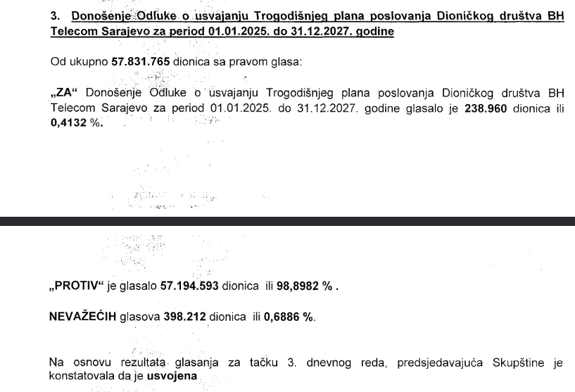 “‘Za’ Donošenje Odluke o usvajanju Trogodišnjeg plana poslovanja Dioničkog društva BH Telecom Sarajevo za period od 01.01.2025. do 31.12.2027. godine glasalo je 238.960 dionica ili 0,4132 %. ‘Protiv’ je glasalo 57.194.593 dionica ili 98,8982 %”, stoji u izvještaju objavljenom na stranici BH Telecoma.