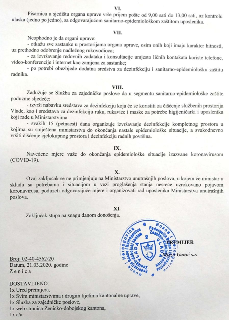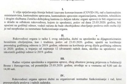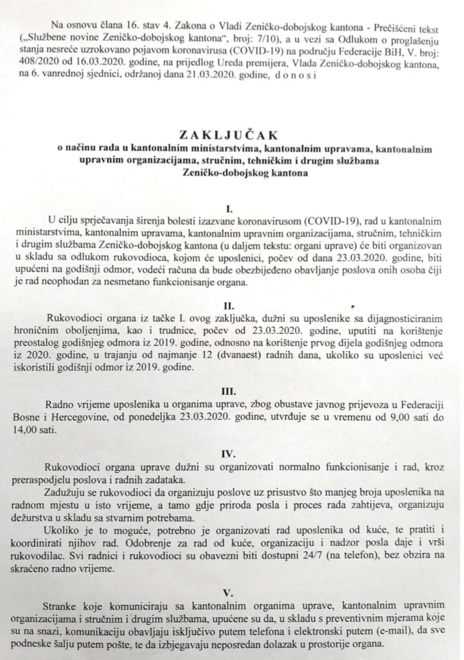 Vlada Zeničko-dobojskog kantona je zaključkom donesenim na današnjoj 6. vanrednoj, telefonskoj sjednici, regulirala način rada kantonalnih ministarstava, uprava, upravnih organizacija, stručnih, tehničkih i drugih službi Zeničko-dobojskog kantona u okolnostima pandemije koronavirusa COVID-19.
