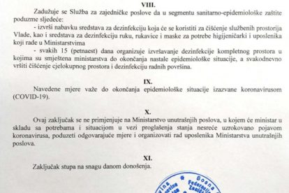 Zaključak Vlade se ne odnosi na Ministarstvo unutrašnjih poslova, u kojem će ministar u skladu sa potrebama i situacijom u vezi proglašenja stanja nesreće uzrokovanog pojavom koronavirusa, poduzeti odgovarajuće mjere i organizirati rad uposlenika MUP-a.