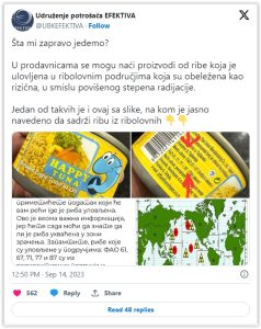 Udruženje potrošača Efektiva na svom Twitter profilu dalo je primer tunjevine na kojoj je jasno navedeno da sadrži ribu iz ribolovnih područja koja su oblježena kao rizična, u smislu povišenog stepena radijacije.