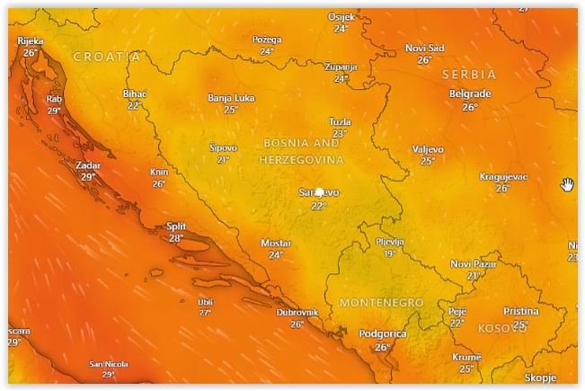 U ostatku dana pljuskovi sa grmljavinom u Hercegovini i zapadnim područjima Bosne. Jutarnja temperatura zraka kretat će se od 16 do 22, na jugu do 24, a dnevna od 25 do 31 stepen celzija.