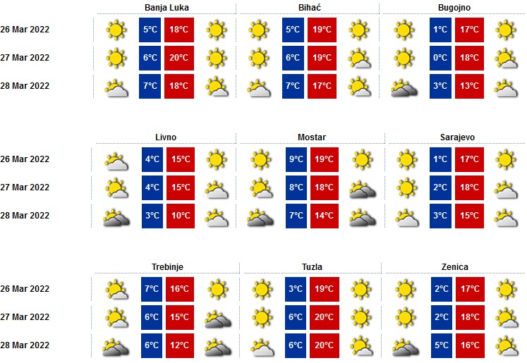 Vremenska prognoza za naredne dane: Uskoro destabilizacija vremena- Danas pretežno sunčano. Vjetar slab u Bosni sjeverni i sjeveroistočni, a u Hercegovini jugozapadni. Jutarnja temperatura od 2 do 8, na jugu do 10, a dnevna od 17 do 23 °C.