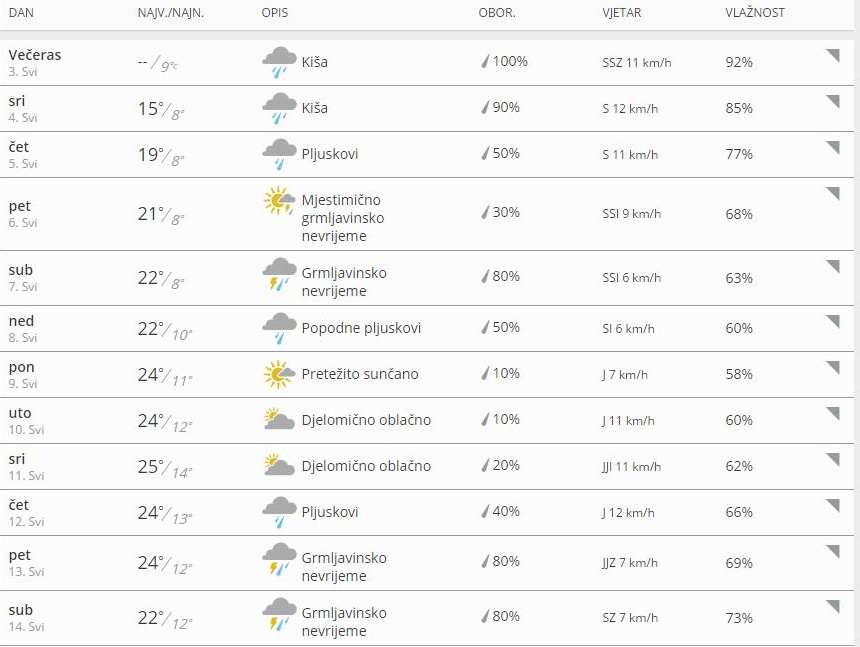 Vremenska prognoza za prvu polovinu maja – U Bosni i Hercegovini sutra će biti pretežno oblačno vrijeme sa kišom ili lokalnim pljuskovima, a najviša dnevna temperatura bit će od 11 do 16, na jugu do 18 stepeni, saopćeno je iz Federalnog hidrometeorološkog zavoda.