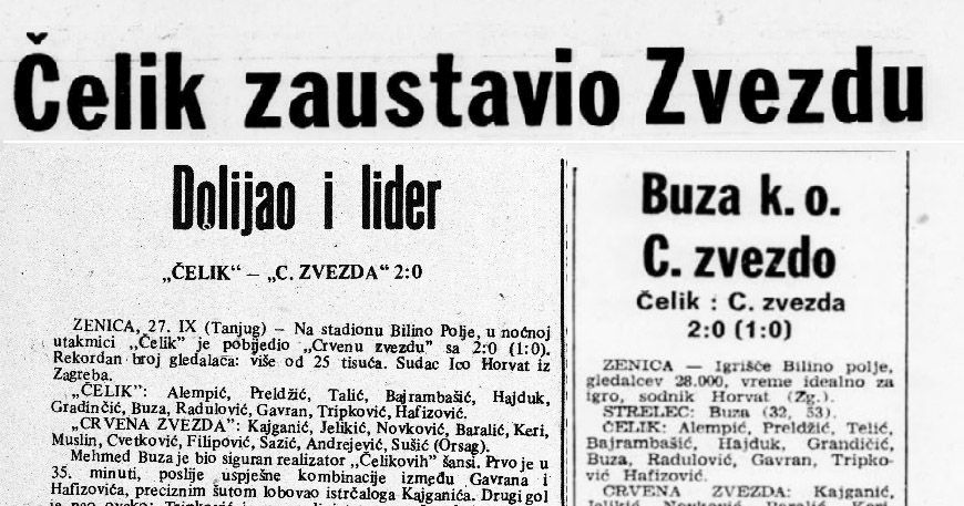 Tako je Buza drugi put u manje od 11 mjeseca postigao dva pogotka u susretu protiv Zvezde, jer je u novembru 1974. donio Čeliku bod na Marakani (2:2). Čelik je sigurno priveo utakmicu kraju i prekinuo nevjerovatnu Zvezdinu seriju. Poraz na Bilinom polju bio je početak pada beogradskog kluba, koji će šamionat zavšiti tek na četvrtom mjestu.