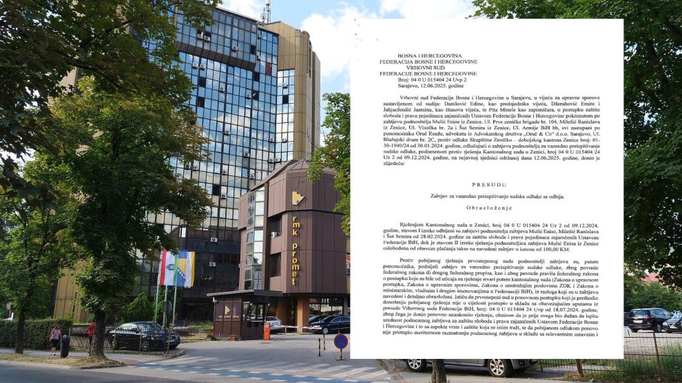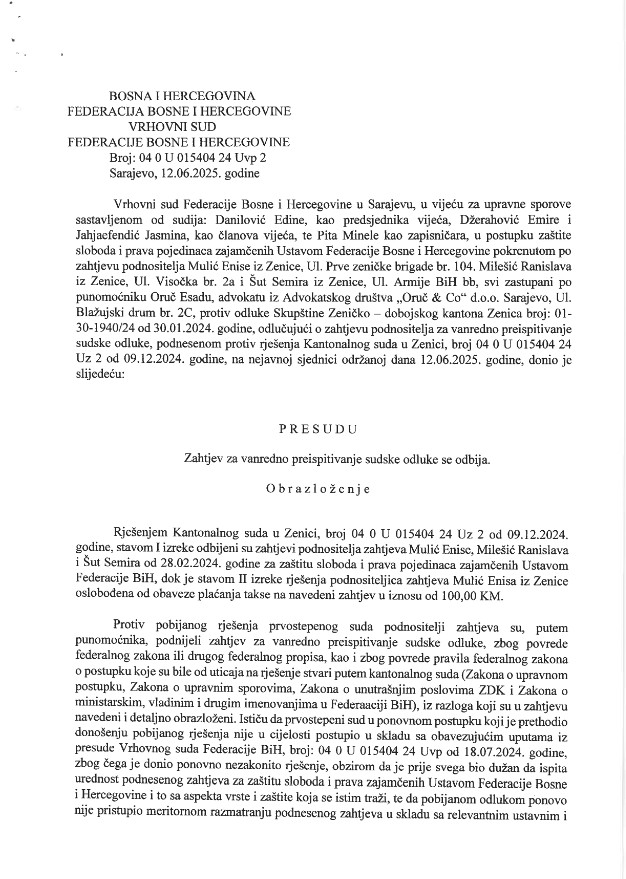 Vrhovni sud Federacije BiH, na sjednici održanoj 12.06.2025. godine, odbio je zahtjev za vanredno preispitivanje sudske odluke protiv rješenja Kantonalnog suda u Zenici vezano za razrješenje dužnosti Enise Mulić, Ranislava Milešića i Semira Šuta sa pozicije članova Nezavisnog odbora za izbor i reviziju policijskog komesara Zeničko-dobojskog kantona.