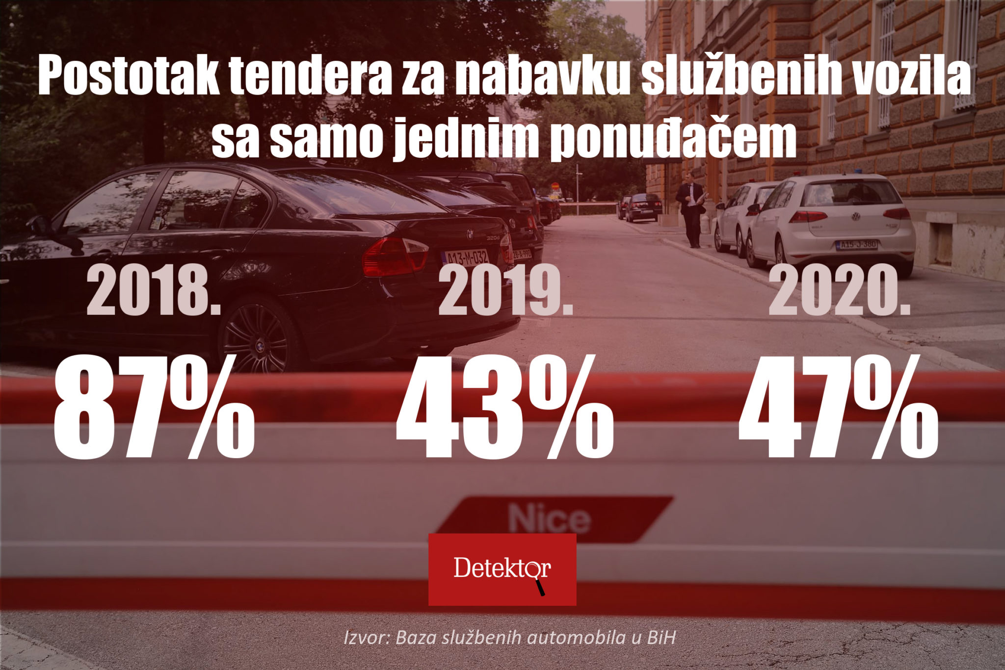 Tokom 2020. godine objavljeno je 366 tendera za nabavku 876 vozila svih vrsta za javna preduzeća i državna tijela procijenjene vrijednosti veće od 44 miliona maraka, pokazuju podaci koje prikuplja Balkanska istraživačka mreža Bosne i Hercegovine (BIRN BiH). Ukupna vrijednost svih završenih tendera je gotovo 22 miliona KM.