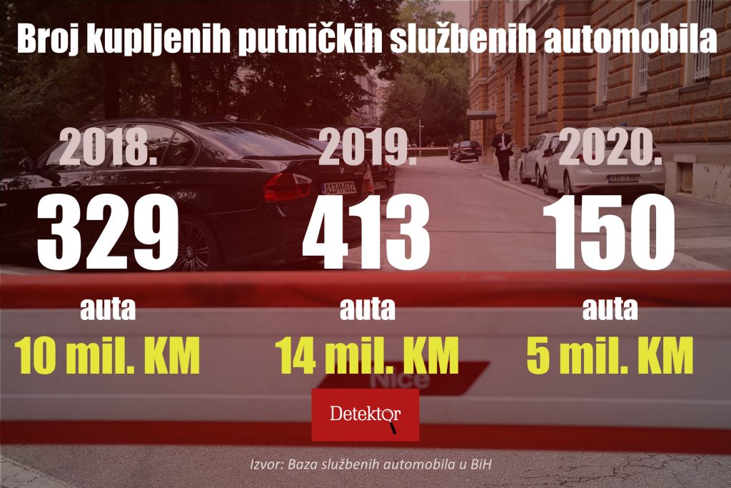 Vrijednost 44 miliona KM: U BiH tokom 2020. godine kupljeno 150 službenih automobila- Institucije i javna preduzeća u Bosni i Hercegovini su 2020. godine, tokom krize uzrokovane pandemijom koronavirusa, potrošile gotovo pet miliona maraka za kupovinu 150 službenih putničkih vozila, pokazuju podaci Baze službenih automobila.