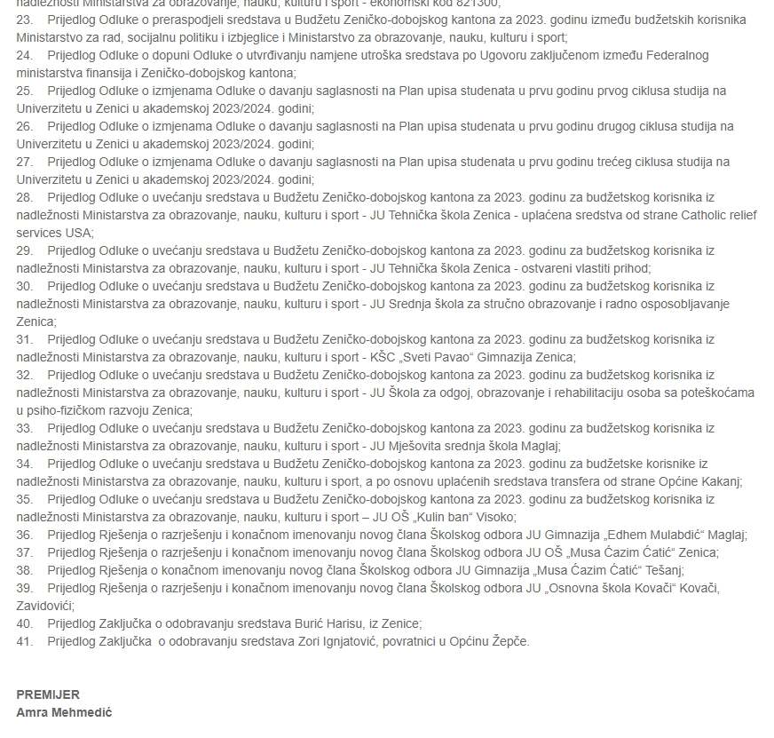 20. Prijedlog Odluke o preraspodjeli sredstava u Budžetu Zeničko-dobojskog kantona za 2023. godinu između budžetskih korisnika Ministarstvo za obrazovanje, nauku, kulturu i sport i Ministarstvo za privredu;