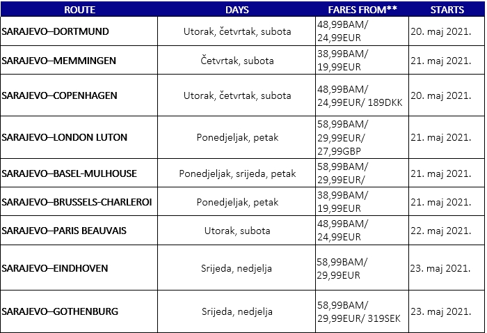 Osim uspostavljanja nove baze, Wizz Air je od maja 2021. najavio i pokretanje devet novih ruta iz Sarajeva ka gradovima u sedam zemalja. Mjesta na novim letovima već se mogu rezervisati na wizzair.com ili putem mobilne aplikacije aviokompanije po cijeni već od 38,99 BAM/ 19,99 eura**.
