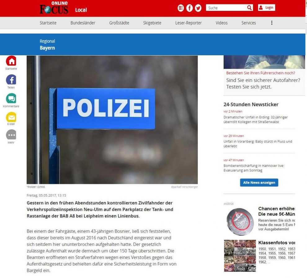 U četvrtak predvečer, patrola saobraćajne policije njemačkog Neu-Ulma zaustavila je međugradski autobus na autoputu A8, u blizini Leipheima. Uslijedila je kontrola svih putnika iz autobusa koja je bila kobna za 43-godišnjeg državljanina BiH, piše njemački Focus. Pregledom dokumenata utvrđeno je da je Bosanac ušao u Njemačku u augustu prošle godine nakon čega nije napuštao zemlju.