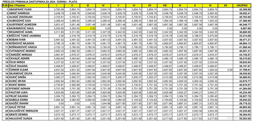 Zamjenici predsjednika radnih tijela imaju koeficijent 8 pa će njihova plaća biti 3.840 KM, a 2024 je iznosila 3.400 KM.
