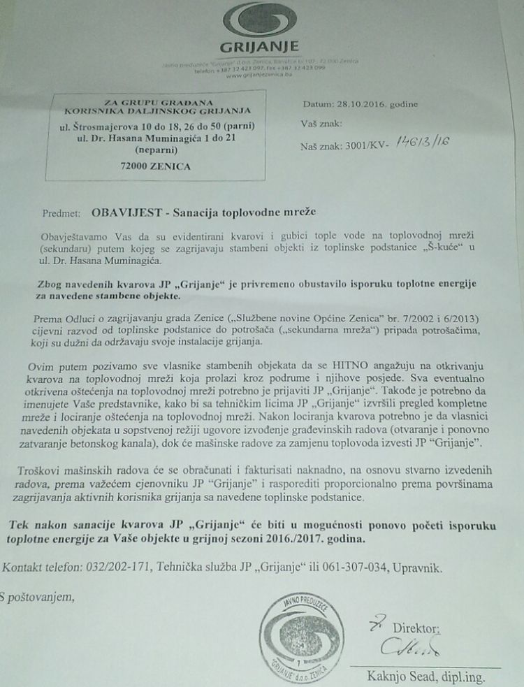Za rubriku “Vjerovali ili ne”: “Grijanje” građanima – locirajte i dođite do mjesta kvara, pa ćemo zamijeniti cijev i naplatiti vam!? – Poštovana redakcijo, danas 28.10.2016. poslije 15h u sandučiće za poštu u ulicama Dr. Hasana Muminagića i Štrosmajerova smo dobili pismo od JP Grijanje Zenica da u našoj sekundarnoj mreži postoji kvar i gubitak vode, te da nećemo imati grijanje dok se kvar ne popravi. Grijanje nam je isključeno 27.10. 2016. ujutro oko 7 sati, a tek danas nas smo ,petak  i to poslije radnog vremena JP Grijanja, obaviješteni  da nas neće uključiti na  mrežu dok se kvar ne popravi,