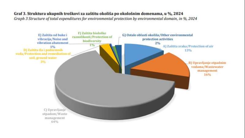 Većina troškova odnosi se na upravljanje otpadom (64,2 posto), upravljanje otpadnim vodama (16,5 posto), zatim slijedi na zaštitu zraka (13,6 posto) i zaštita i sanacija tla i podzemnih voda (3,1 posto), podaci su koje je objavila Agencija za statistiku BiH.