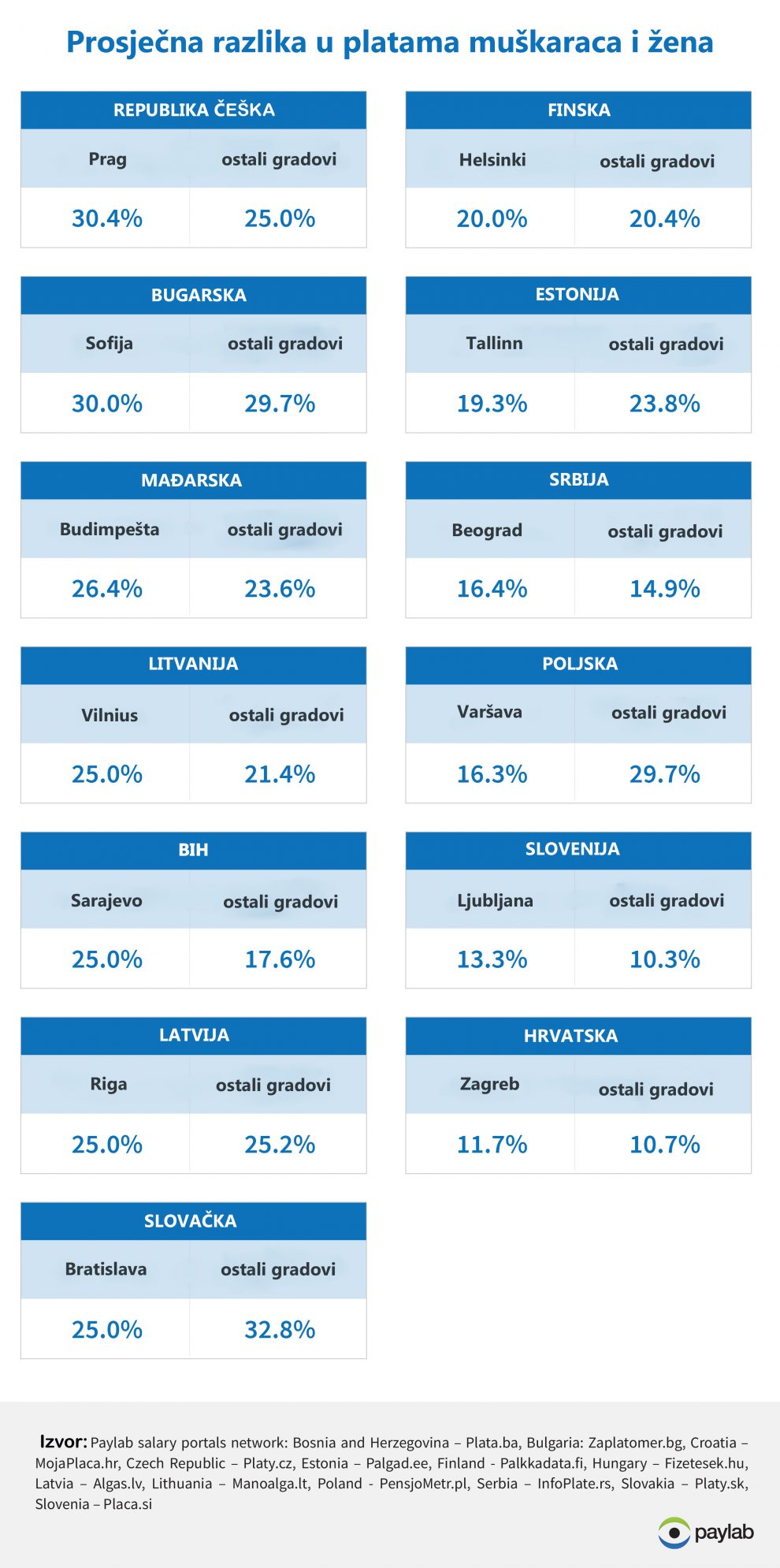 Među zemljama koje su učestvovale u istraživanju, razlike u platama najveće su u Bugarskoj, Češkoj i Slovačkoj, gdje su prosječne plate muškaraca za 28 do 30% veće od plata žena, a najmanje u Hrvatskoj i Sloveniji – u prosjeku 10 do 11% u korist muškaraca.