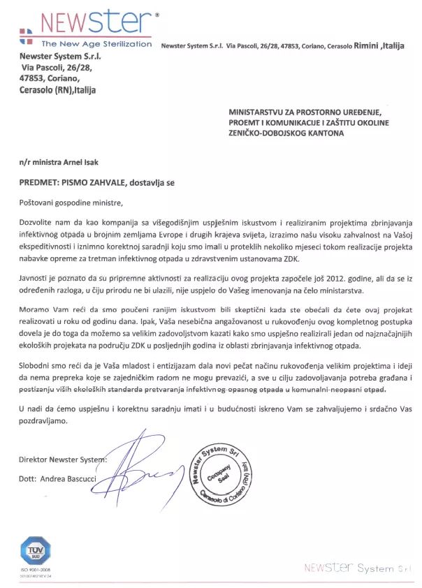 Ministarstvo za prostorno uređenje, promet i komunikacije i zaštitu okoline Zeničko-dobojskog kantona i ministar Arnel Isak primili su nedavno Zahvalnicu italijanske kompanije Newster s.r.l. Cerasolo za korektnu saradnju na realizaciji projekta zbrinjavanja infektivnog otpada u ZDK.