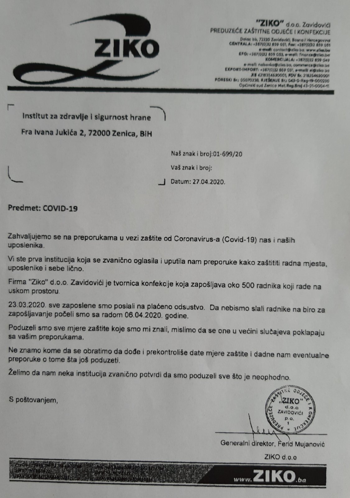 Osim iz AMZ, ovih dana svojevrsnu zahvalnicu za učinjeno dobili smo od uprave zavidovićke kompanije ZIKO. Njen prvi čovjek Ismet Mujanović se zahvalio na svim mjerama i postupcima koje je INz proveo u proteklom periodu, te zatražio dodatne informacije i postupke za sigurnost svih svojih zaposlenika, što ukazuje na ozbiljnost pristupa i ove kompanije.