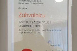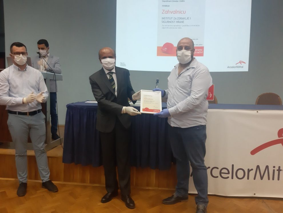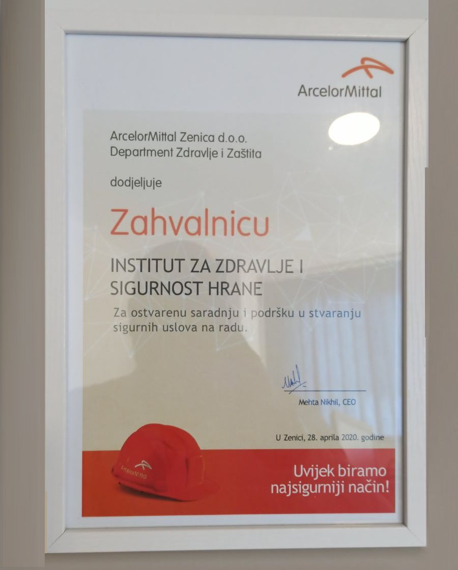 Rukovodilac Službe za dezinfekciju, dezinsekciju i deratizaciju (DDD) Instituta za zdravlje i sigurnost hrane Zenica (INZ) Admir Gluhić primio je danas u ime INZ-a Zahvalnicu kompanije ArcelorMittal Zenica (AMZ) za ostvarenu saradnju i podršku u stvaranju sigurnih uslova na radu.