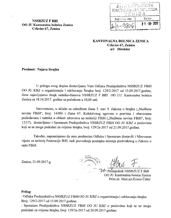 Donosimo tekst odluke koja je predata direktoru Kantonalne bolnice Zenica.