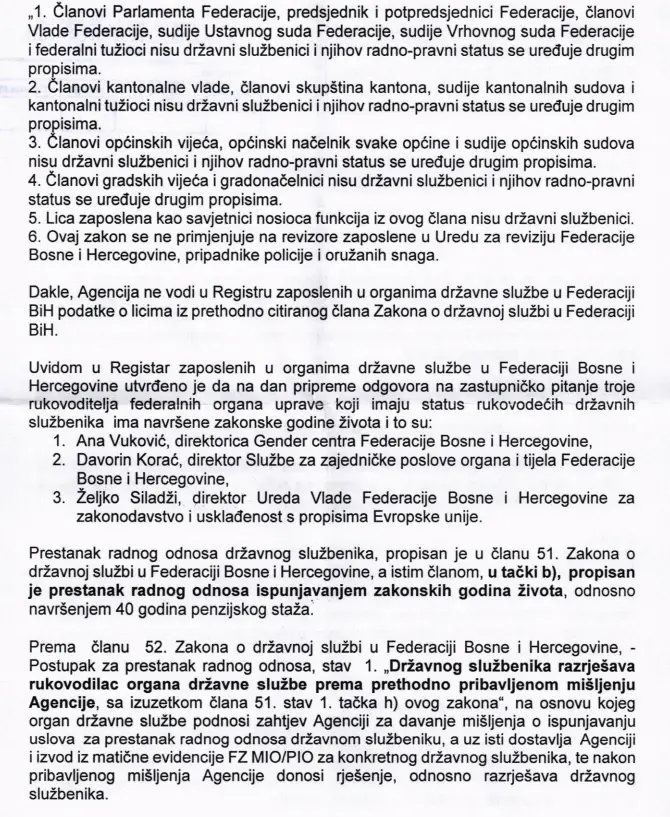 – Uvidom u u Registar zaposlenih u organima državne službe u FBiH utvrđeno je da na dan pripreme odgovora na zastupničko pitanje troje rukovodilaca federalnih organa uprave koji imaju status rukovodećih državnih službenika ima navršene zakonske godine i to: