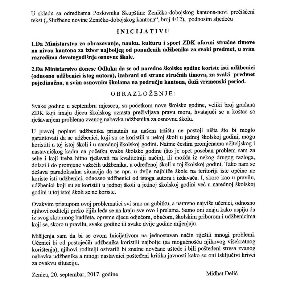 Zastupnik Midhat Delić podnio inicijativu u Skupštini ZDK: Stop stalnoj promjeni udžbenika – Zastupnik u Skupštini ZDK, Kakanjac Midhat Delić (DF), pokrenuo je na posljednjoj sjednici Skupštine uputio inicijativu prema Ministarstvu obrazovanja ZDK da se od naredne školske godine u svim školama na području kantona koriste isti udžbenici.