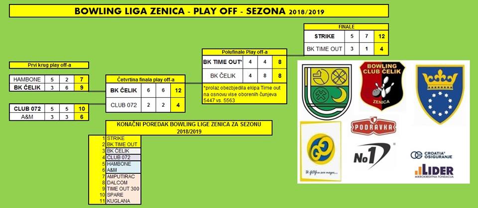 Završena Bowling liga Zenica sa sezonu 2018/2019 – Finalnim susretima ekipa BK Time Out i Strike spuštena je zavjesa na još jednu Bowling Ligu Zenice. Konačni pobjednik je ekipa Strike, koja je u oba susreta bila bolja od ekipe Time out i sa ukupnih 12:4, sasvim zasluženo, osvojila titulu prvaka Bowling Lige Zenica za sezonu 2018/2019. Srebrom su se okitili momci iz ekipe Time Out, a bronzani su igrači BK Čelik.