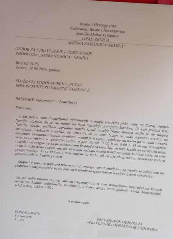 Jedan od članova Odbora za vodu Mjesne zajednice Nemila, naselja Stara stanica, uputio je javni apel zbog alarmantnog smanjenja kapaciteta lokalnog izvorišta, za koje mještani tvrde da je direktna posljedica građevinskih radova na bušenju tunela iznad ovog područja. Prema informacijama iz Odbora, količina vode na izvorištu je s nekadašnjih 100 litara u minuti drastično pala na svega 10 litara, što je izazvalo ozbiljne poremećaje u snabdijevanju stanovništva.