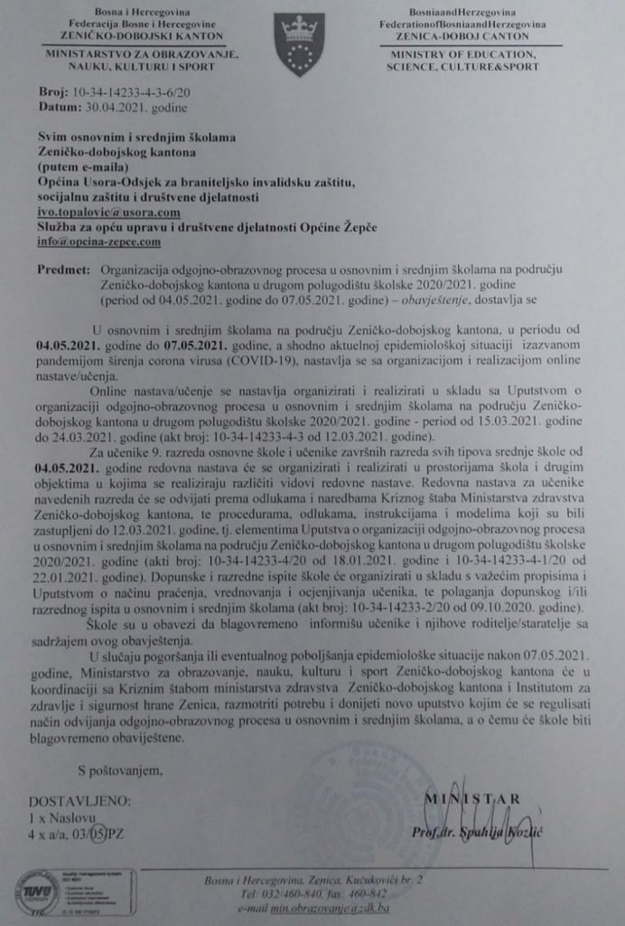 Usljed poboljšanih epidemioloških uslova te na osnovu najnovijih preporuka Kriznog štaba Ministarstva zdravstva Zeničko-dobojskog kantona, Ministarstvo obrazovanja, nauke, kulture i sporta ZDK donijelo je odluku o povratku u školske klupe učenika završnih razreda osnovnih i srednjih škola u tom kantonu – potvrdio je v.d. premijera i ministar obrazovanja tog kantona prof. dr. Spahija Kozlić.