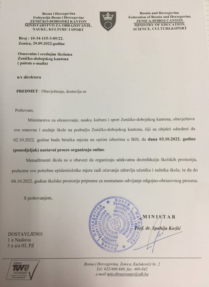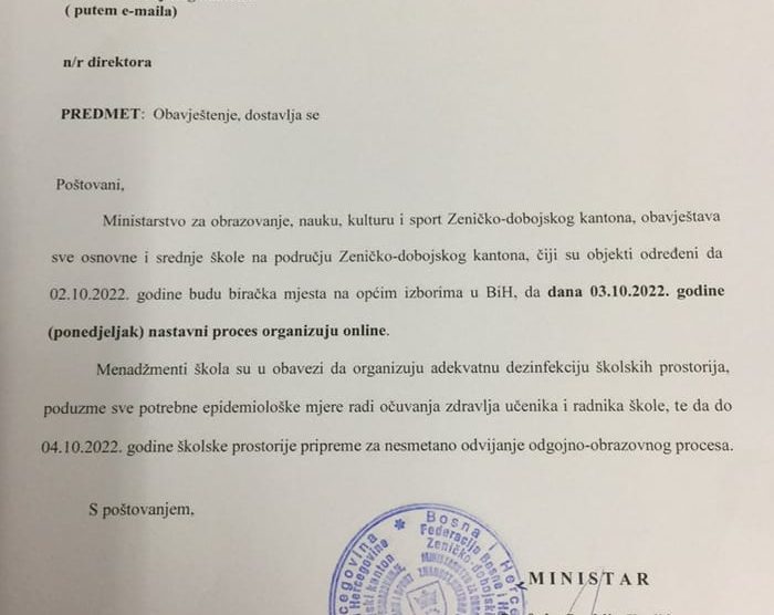 Povodom toga, ministar za obrazovanje, nauku, kulturu i sport ZDK Spahija Kozlić je na svom Facebook profilu objavio dopis osnovnim i srednjim školama, u kojima će se obaviti proces glasanja na predstojećim izborima, u ponedjeljak, 03. 10. 2022. godine održati online nastavu.