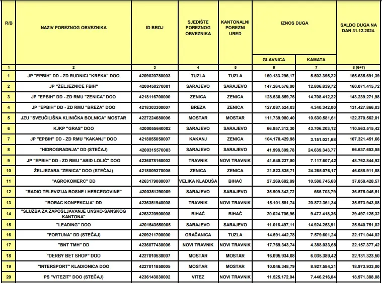 Riječ je o dugu po osnovu poreza, doprinosa, taksi i drugih naknada, a navedeni su svi dužnici s dugom od preko 50.000 KM.