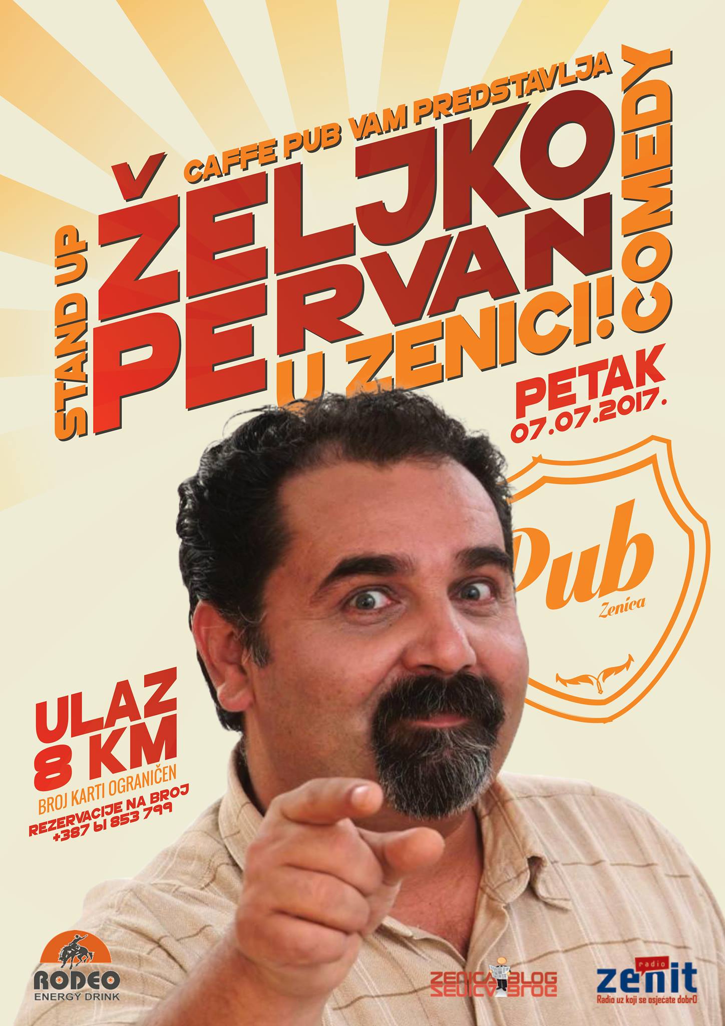 Željko Pervan u Zenici, 7. jula – Caffe Pub – Jedan od najboljih stand up komičara na ovim prostorima Željko Pervan 7. jula, nastavlja u caffeu Pub seriju stand up događaja, po kojima je ovaj objekt postao poplaran i van granica našeg grada.