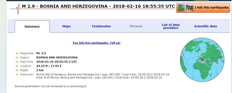 Zemljotres jačine 2, 9 Rihtera zabilježen dva kilometra sjeverno od Zenice – Prema podacima EMSC, dva kilometara sjeverno od Zenice oko 20 sati je zabilježen zemljotres jačine 2,9 Rihtera. Zemljotres je potresao večeras područje Zenice, bio je na dubini dva kilometra, a epicentar mu je bio dva kilometra sjeverno od Zenice. Zemljotres ove jačine osjeti veliki broj stanovnika, ali ne izaziva materijalnu štetu