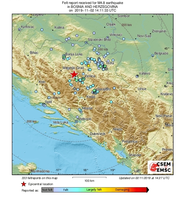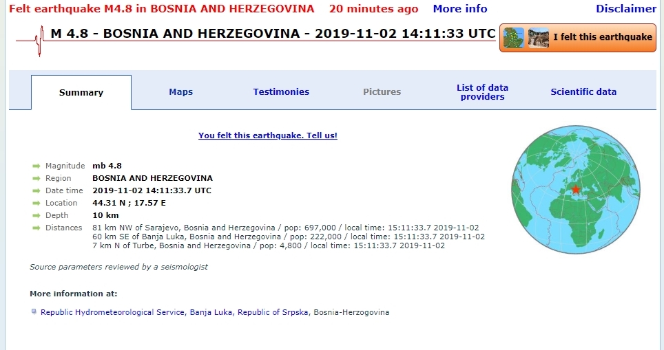 Prema evropskoj bazi podataka o zemljotresima, epicentar zemljotresa kojeg su oko 15.11 osjetili i Zeničani je bio magnitude 4.8, dogodio s epicentrom nadomak Turbeta, oko devet kilometara sjevernije od ovog mjesta, i to na dubini od 10 kilometara.
