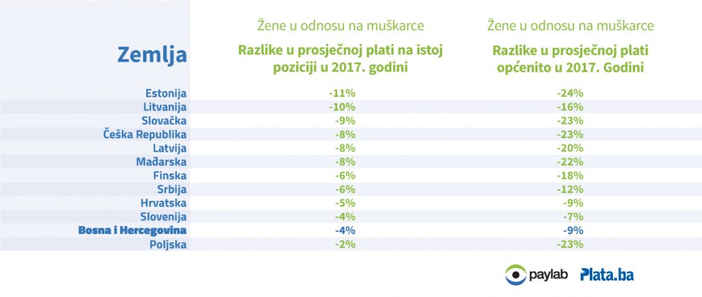Iako Bosna i Hercegovina nije na samom vrhu liste zemalja srednjoistočne Evrope koje više plaćaju rad muškaraca u odnosu na rad žena, ipak, plata žene u Bosni i Hercegovini je za 4% manja od plate muškarca na istoj poziciji. Dakle, nejednakost samo na osnovu spola postoji kada je u pitanju iznos plate u Bosni i Hercegovini.