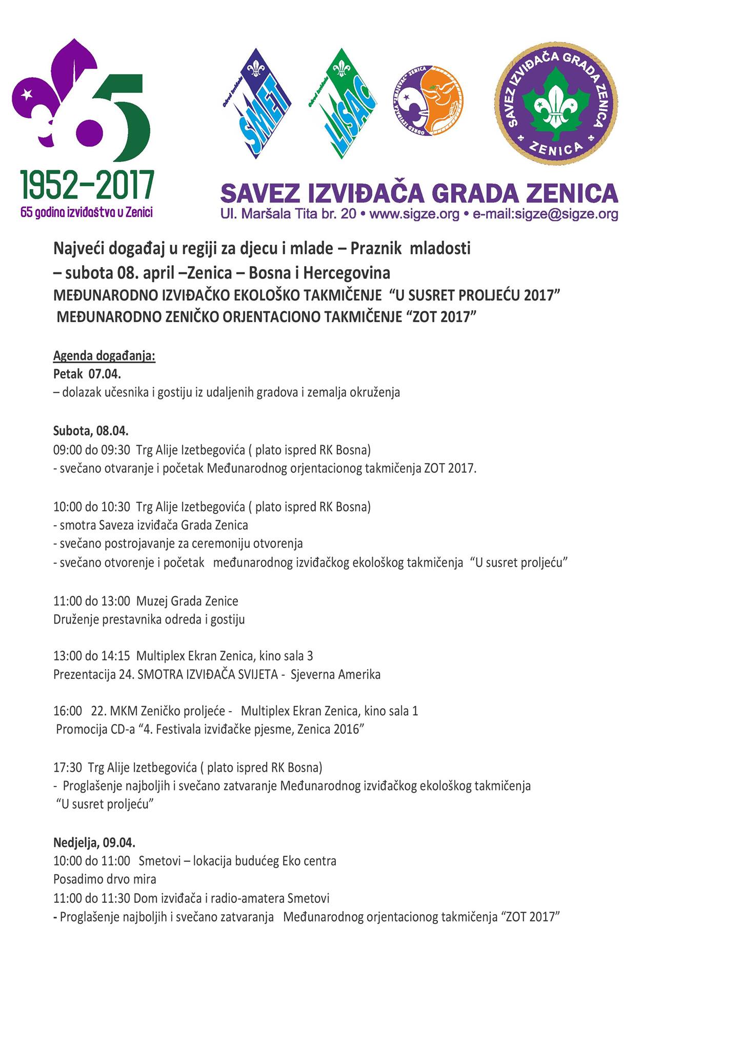 MEĐUNARODNO IZVIĐAČKO EKOLOŠKO TAKMIČENJE “U SUSRET PROLJEĆU 2017” MEĐUNARODNO ZENIČKO ORJENTACIONO TAKMIČENJE “ZOT 2017” Slijedite agendu događanja