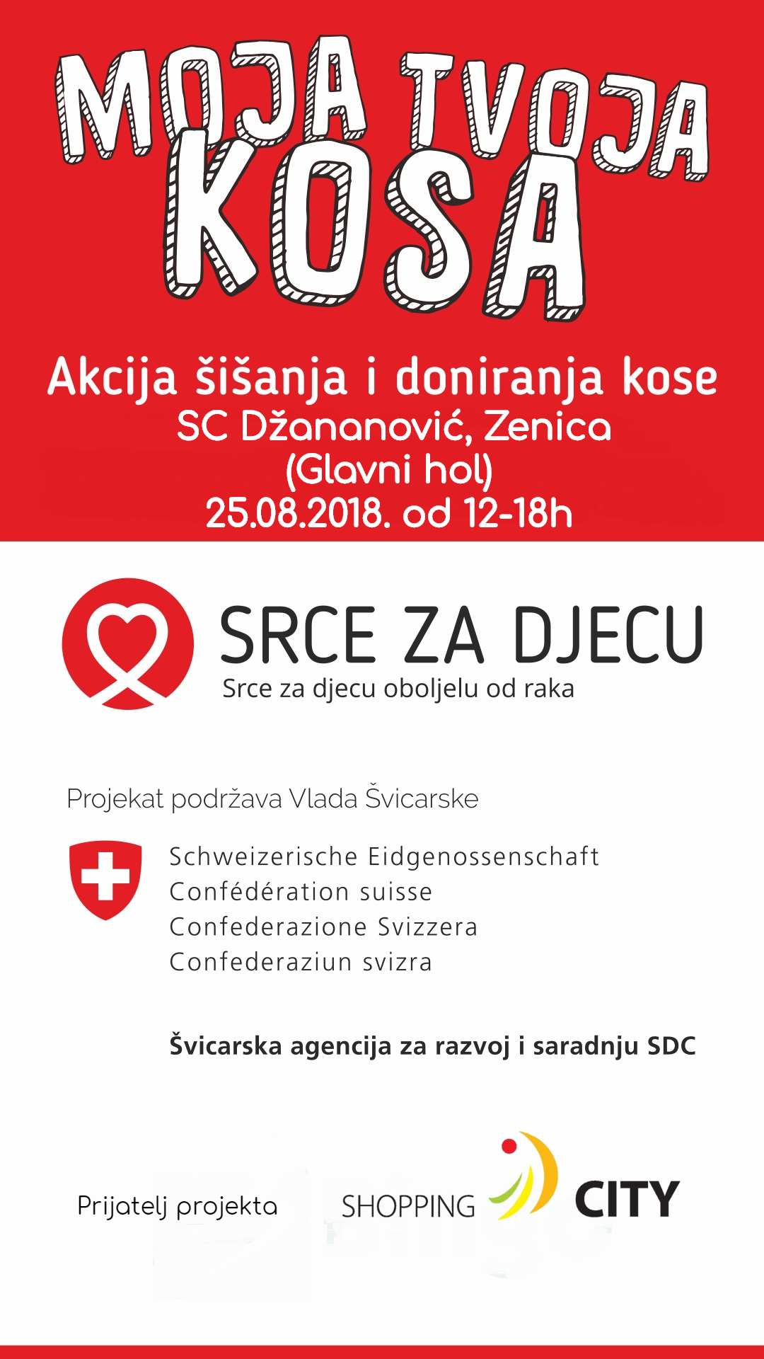 Sve građane Zenice i okolice pozivamo da dođu u SC Džananović, 25. avgusta od 12:00 do 18:00 sati i doniraju kosu za potrebe izrade perika djeci oboljeloj od raka.