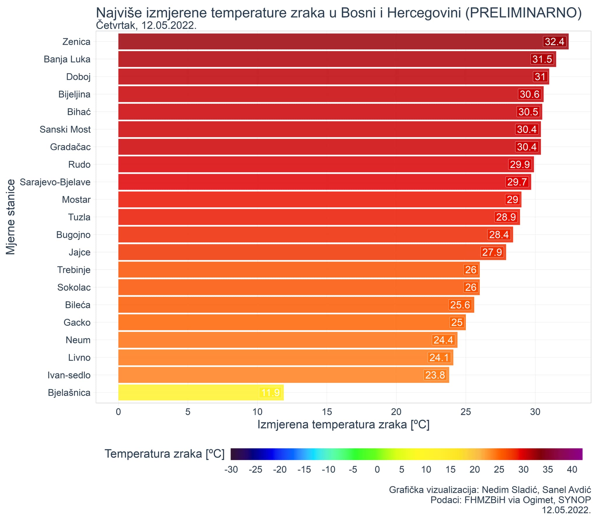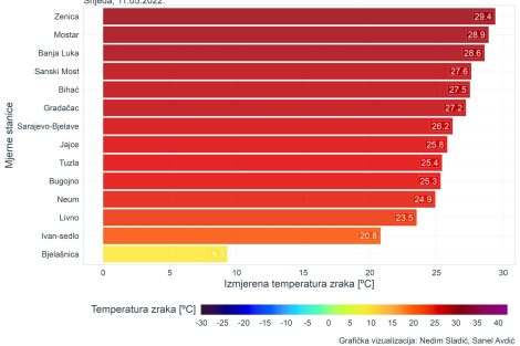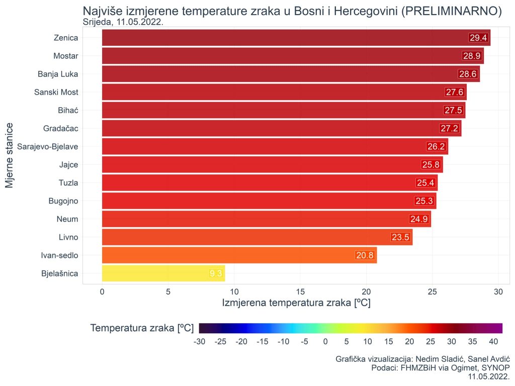 “Zenica je u četvrtak, 12.05.2022. bila najtopliji grad Bosne i Hercegovine sa vrelih 32,4 °C! Na još najmanje šest stanica zabilježen je vreli dan, odnosno dan u kojem temperatura zraka je veća ili jednaka od 30,0 °C.