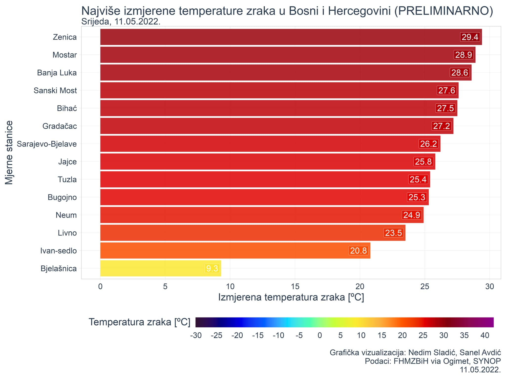 “Zenica je danas, 11.05.2022. sa izmjerenih 29,4 °C bila najtopliji grad u Bosni i Hercegovini, po preliminarnim podacima koji će biti zvanični sutra u 06:00 UTC (08:00 po lokalnom vremenu). Termobarički greben koji se osom proteže sa zapada Europe preko juga Francuske i sjeverne Italije prema našim područjima dodatno jača svoj utjecaj, a pojačava se i priliv toplijeg zraka. Sutra najviše dnevne temperature zraka većinom od 26 do 30, lokalno oko Zenice, Mostara i Banja Luke je moguće i do 32 °C.”