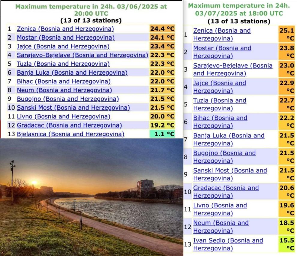 Zenica je danas drugi dan zaredom ponovo najtoplija sa 25.1 °C, objavio je meteorolog Nedim Sladić.