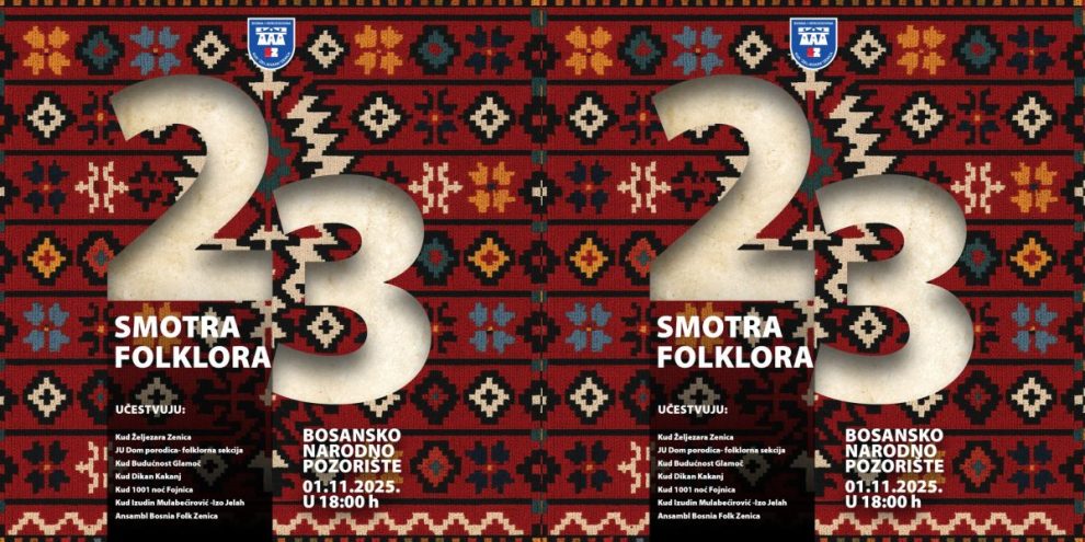 Grad Zenica će i ove godine biti domaćin istinskog praznika kulture, tradicije i narodnog stvaralaštva! U organizaciji Kulturno-umjetničkog društva „Željezara Zenica“, 01. novembra 2025. godine u Bosanskom narodnom pozorištu Zenica, s početkom u 18:00 sati, održat će se 23. Smotra folklora – manifestacija koja već više od dvije decenije okuplja ljubitelje folklora i čuvare bogate kulturne baštine naroda Bosne i Hercegovine.