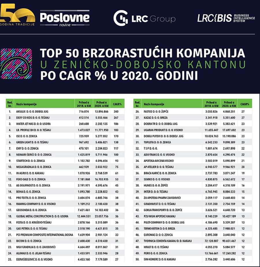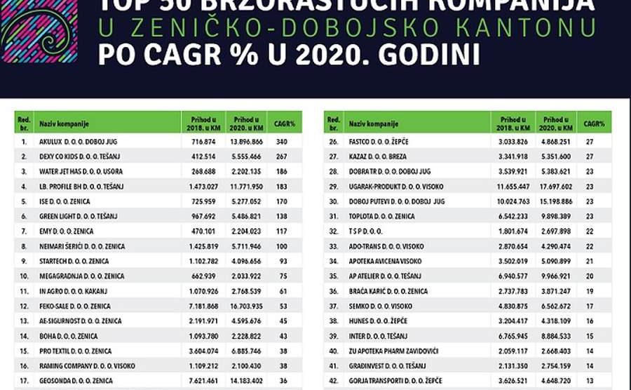 I koje naš šampion u Zeničko-dobojskom kantonu i koja kompanija je uprkos totalnom zatvaranju ekonomije u 2020. uspjela čak i rasti? To je kompanija Akulux, koja posluje na području općine Doboj jug s rastom po CAGR-u od 340 posto. Ova kompanija je u 2018. godini imala prihod od 716.874 KM, a u 2020. im je prihod narastao na čak 13,8 miliona KM. Kompanija Akulux se bavi proizvodnjom ALU i PVC stolarije. U „ličnoj karti“ Akulux piše da je prije 11 godina imao samo deset radnika i jedan kamion izvoza mjesečno. Danas u Akuluxu radi 150 radnika i izvoza dva kamiona svojih proizvoda dnevno. Fabrika raspolaže najnovijim i najsavremenijim brendovima mašinskog pogona za PVC i ALU. Akulux je danas jedna od vodećih kompanija za proizvodnju ALU i PVC stolarije u Bosni i Hercegovini i bez sumnje će se poslovi ove kompanije još više širiti.