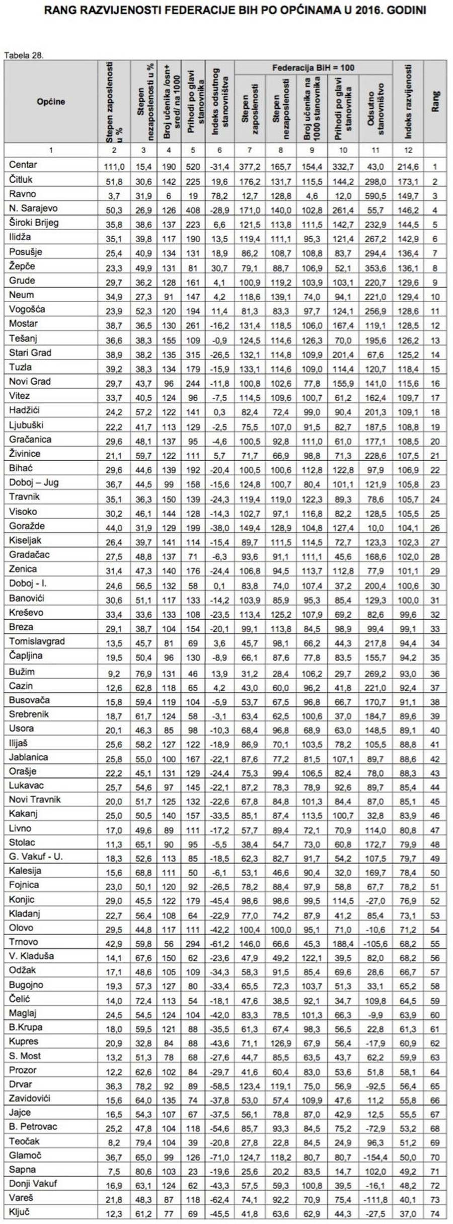 Zenica tek na 29. mjestu po razvijenosti u Federaciji BiH – Prema rangu razvijenosti općina i gradova u Federaciji BiH za 2016. godinu, a koje je objavio Federalni zavod za programiranje razvoja, najrazvijenija općina je Centar Sarajevo, a odmah iza nje dolaze Čitluk, Ravno, Novo Sarajevo, Široki Brijeg…