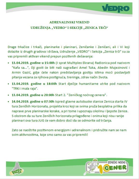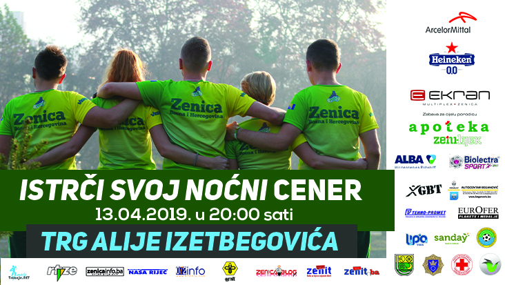 Zenica trči: izmjena režima saobraćaja u subotu, 13. aprila – Sekcija «Zenica trči», formirana u okviru Udruženje za razvoj i podršku planinarstva i sportskog turizma «VEDRO» Zenica (organizator utrke), na osnovu Rješenja Ministarstva za prostorno uređenje, promet i komunikacije i zaštitu okoliša ZDK broj: 12-27-1254/19 od 12.02.2019. godine i Saglasnosti za izmjenu režima saobraćaja Gradske uprave grada Zenica broj: 09-23-3971/19 od 28.03.2019. godine  obavještava javnost i sve učesnike u saobraćaju da će se dana 13.04.2019. godine u vremenu od 19:45h do 22:00h za potrebe realizacije rekreativne utrke pod nazivom 2. „Zenički noćni cener“ izvršiti privremena obustava i izmjena režima saobraćaja kako slijedi: