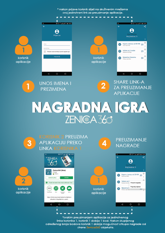 Zenica360 nagradna igra – Preuzmite Zenica360 mobilnu aplikaciju i automatski učestvujte u Zenica360 nagradnoj igri. Nagrade koje možete osvojiti poklanjaju objekti i sponzori Zenica360 projekta. Svaka nagrada vrijedi određeni broj bodova koje morate skupiti kako biste osvojili neku od tih nagrada.