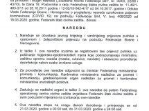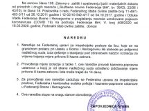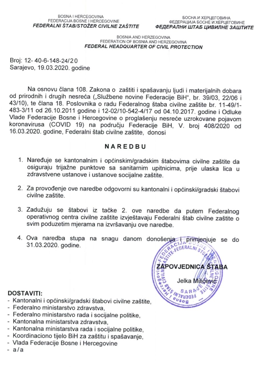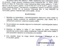 Kantonalnim i općinskim/gradskim štabovima civilne zaštite naređeno je da osiguraju trijažne punktove sa sanitarnim upitnicima prije ulaska lica u zdravstvene ustanove.