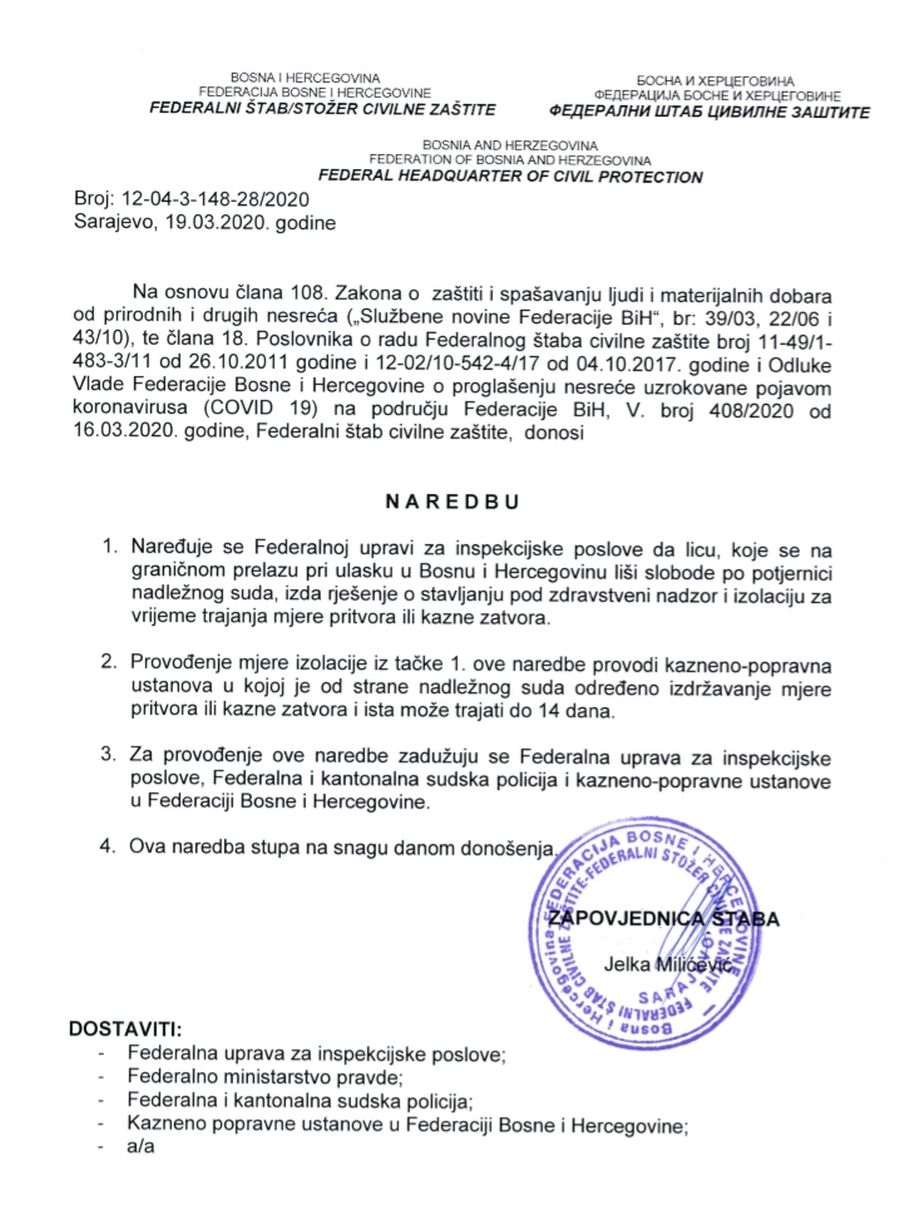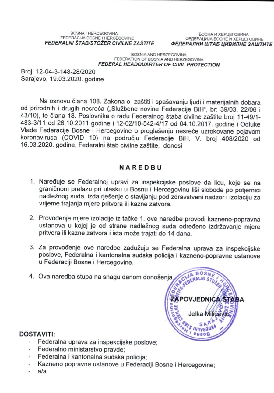 Naređuje se Federalnoj upravi za inspekcijske poslove da licu koje se na graničnom prelazu, pri ulasku u Bosnu i Hercegovinu, liši slobode po potjernici nadležnog suda, izda rješenje o stavljanju pod zdravstveni nadzor i izolaciju za vrijeme trajanja mjere pritvora ili kazne zatvora. Provođenje mjere izolacije je u obavezi kazneno-popravne ustanove u kojoj je od strane nadležnog suda određeno izdržavanje mjere pritvora ili kazne zatvora i ona može trajati do 14 dana.