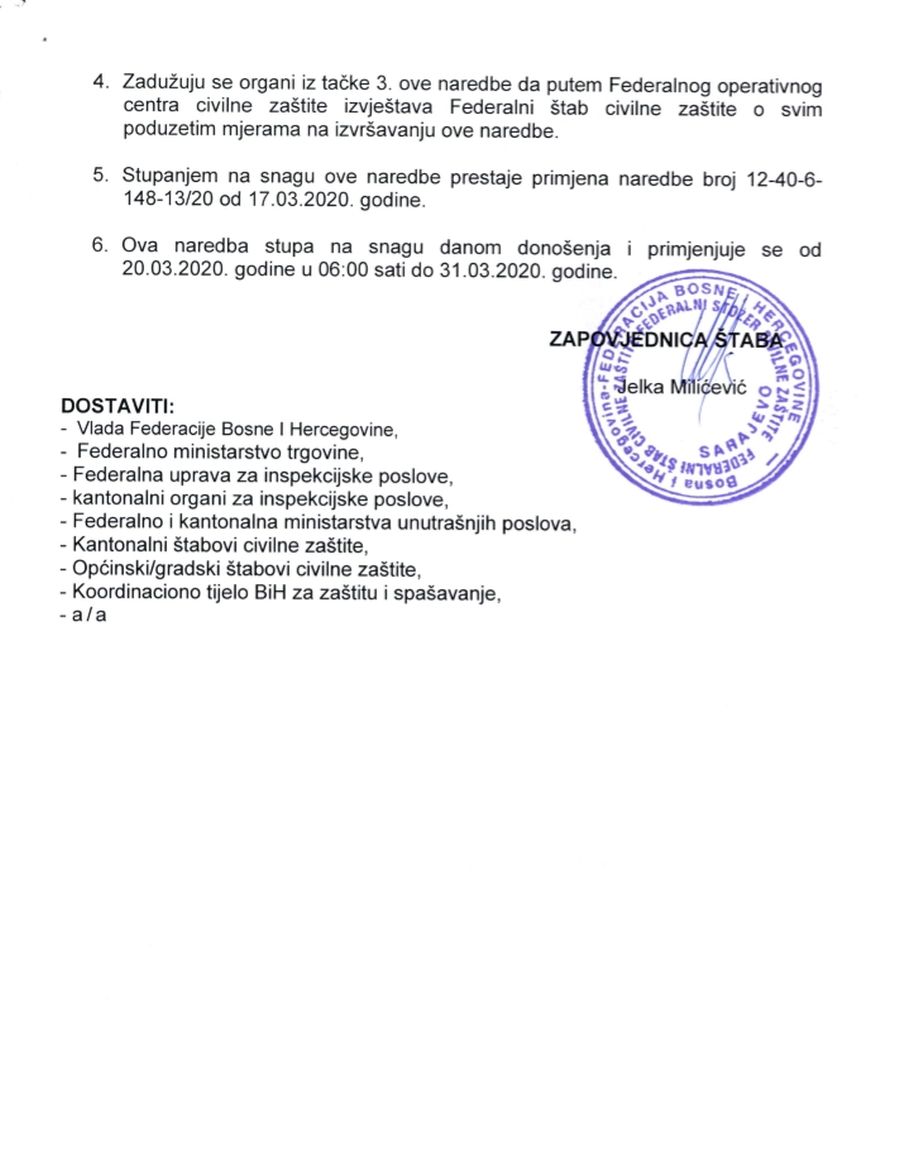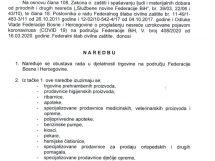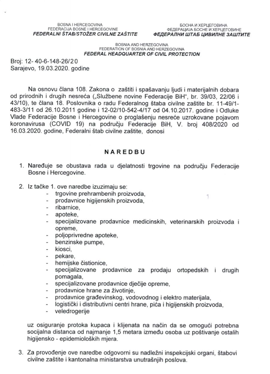 Obustavlja se rad u djelatnosti trgovine na području FBiH, osim trgovina prehrambenih proizvoda, prodavnica higijenskih proizvoda, ribarnica, apoteka, specijalizovanih prodavnica medicinskih, veterinarskih proizvoda i opreme, poljoprivrednih apoteka, benzinskih pumpi, kioska, pekara, hemijskih čistionica, specijalizovanih prodavnica za prodaju ortopedskih i drugih pomagala, specijalizovanih prodavnica dječije opreme, prodavnica hrane za životinje, prodavnica građevinskog, vodovodnog i elektro-materijala, logističkih i distributivnih centara hrane, pića i higijenskih proizvoda i veledrogerija, uz osiguranje protoka kupaca i klijenata na način da se omogući potrebna socijalna distanca od najmanje 1,5 metar između osoba uz poštivanje ostalih higijensko – epidemioloških mjera.